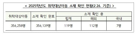 학교·지자체 및 관할 경찰서가 협력하여 취학대상아동의 소재·안전을 확인한 결과, 올해 취학대상아동 총 356,258명 중 99.9%에 해당하는 356,139명의 소재를 최종 확인했다.