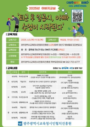 (아름다운교육신문) 광주광역시교육청시민협치진흥원은 유·초·중학생 자녀를 둔 아버지를 대상으로 오는 6월부터 9월까지 ‘2025 아버지 교실 – 퇴근 후 일곱시, 아빠 수업이 시작된다’를 운영한다.