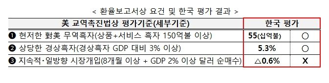 우리나라는 3개 요건 중 對美 무역흑자 및 경상흑자 2개 요건에 해당하여, 지난 ’24년 하반기 환율보고서에 이어 관찰대상국 분류를 유지했다.