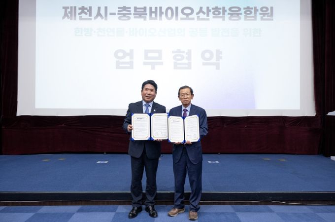 (아름다운교육신문) 제천시는 9월 30일 ‘2025 제천국제한방천연물산업엑스포’ 기간 중 한방생명과학관 다목적강당에서 충북바이오산학융합원과 한방·천연물산업 발전을 위한 업무협약(MOU)을 체결했다.