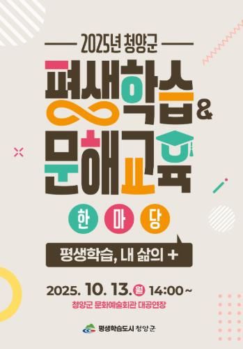 (아름다운교육신문) 청양군은 오는 13일 오후 2시 청양군 문화예술회관 대공연장에서 군민 모두가 함께 배우고 즐기는 축제, ‘2025 평생학습 & 문해교육 한마당’을 개최한다.