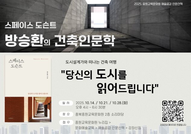 오는 10월 14일(화)부터 28일(화)까지, 매주 화요일 오후 4시부터 약 3시간 동안 진행되는 이번 강연은 '도시 설계가와 떠나는 건축 여행'을 주제로 건축가 방승환을 초청하여 건축과 도시 공간을 통합적으로 읽어보는 인문학 강연으로 구성된다.