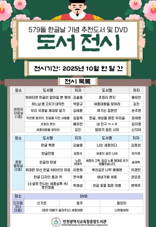 (아름다운교육신문) 인천광역시교육청중앙도서관은 한글 창제 579돌을 기념해 10월 한 달 동안 ‘한글날 추천 도서 및 DVD’ 전시를 운영한다.