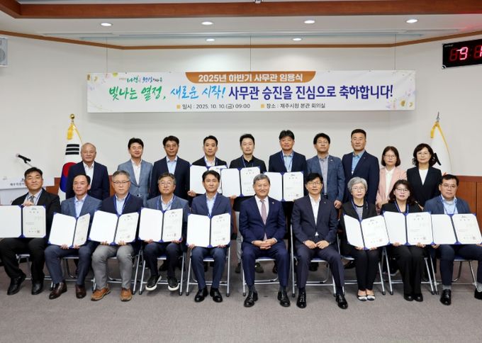 (아름다운교육신문) 제주시는 2025년 10월 3일자 사무관 승진 임용자 11명에 대해서 10월 10일 제주시청 본관 회의실에서 임용장 수여식을 개최했다.
