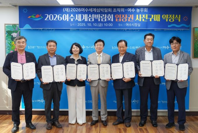 (아름다운교육신문) (재)2026여수세계섬박람회조직위원회는 지난 10일 여수시청 시장실에서 여수 농우회와 2026여수세계섬박람회 입장권 5,100만 원 규모의 사전 구매 약정을 체결했다고 밝혔다.