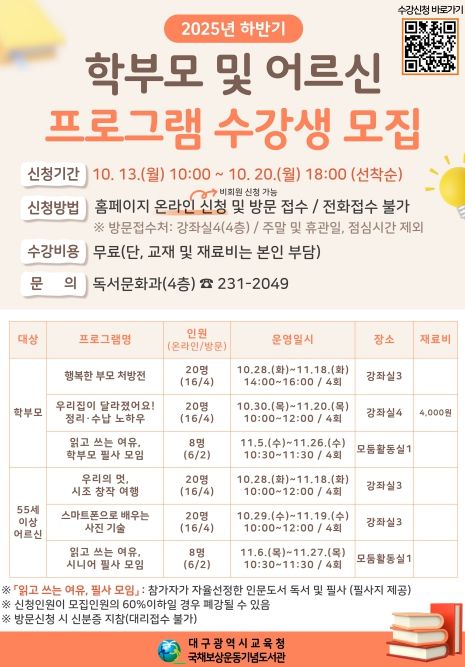 어르신 대상으로는 ▲시조를 이해하고 창작해 보는 ‘우리의 멋, 시조 창작 여행, 스마트폰 카메라 활용법’, ▲사진 편집 방법을 익힐 수 있는 ‘스마트폰으로 배우는 사진 기술’ 프로그램을 운영한다. 또한, ▲학부모 및 어르신 대상 자율 선정한 인문도서를 필사하는 ‘읽고 쓰는 여유, 필사 모임’을 진행한다.