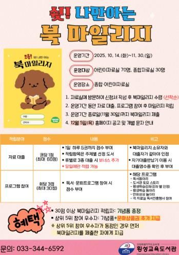 참여 신청은 10월 14일부터 종합자료실 및 어린이자료실에서 선착순으로 북 마일리지를 배부받으면 된다.