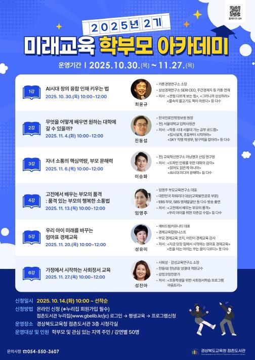 (아름다운교육신문) 경상북도교육청 점촌도서관은 10월 30일부터 11월 27일까지 학부모 및 일반인을 대상으로 2025년 2기'미래교육 학부모 아카데미'를 운영한다.