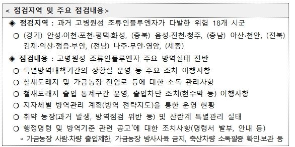과거 고병원성 조류인플루엔자가 다발한 18개 시·군 대상으로 10월 15일부터 10월 24일까지 관계기관(농식품부·행안부·검역본부·시도) 합동점검 추진