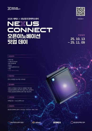 (아름다운교육신문) (재)충남창조경제혁신센터와 세메스(주)는 반도체·디스플레이 장비 혁신을 이끌 유망 스타트업을 발굴·육성하기 위해 ‘2025 세메스 × 충남창조경제혁신센터 Nexus Connect 오픈이노베이션 밋업 데이’ 참여 기업을 11월 9일까지 모집한다.