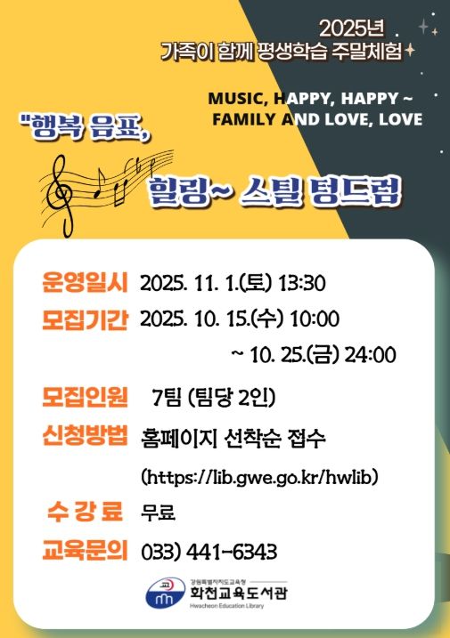 (아름다운교육신문) 강원도교육청 화천교육도서관은 군민을 대상으로 2025년 11월 평생학습 주말체험 ‘늦가을, 가족 음악 특강: 행복 음표, 힐링 스틸 텅드럼’을 운영한다.