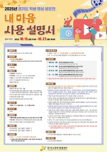 (아름다운교육신문) 경기도교육복지종합센터가 경기도교육청 소속 초 중 고등학교 학생들을 대상으로 ‘2025년 경기도 학생 영상 공모전’을 개최한다.