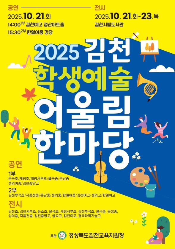 (아름다운교육신문) 경상북도김천교육지원청은 오는 10월 21일 김천예술고등학교와 한일여자중학교에서 공연 행사를 열고, 김천시립도서관에서 전시 행사(21일-23일)를 통해 ‘2025 김천학생예술어울림한마당’을 개최한다.