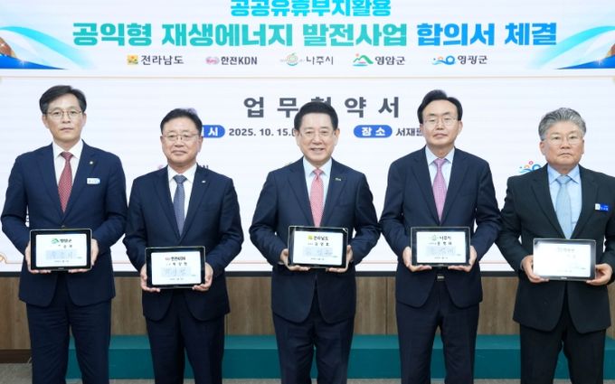 (아름다운교육신문) 전라남도는 15일 새정부의 재생에너지 대전환 기조와 재생에너지 보급 확대 정책에 따라 나주시, 영광군, 영암군, 한전KDN과 탄소중립 실현·에너지 기본소득 실현을 위한 ‘공익형 재생에너지 발전사업’ 업무협약을 했다고 밝혔다.