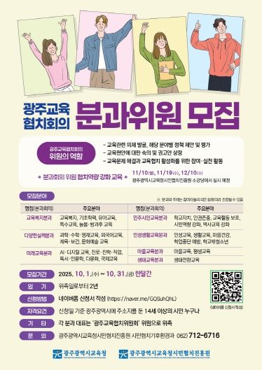 (아름다운교육신문) 광주시교육청시민협치진흥원이 ‘광주교육협치회의 2기 분과위원’을 공개모집한다.