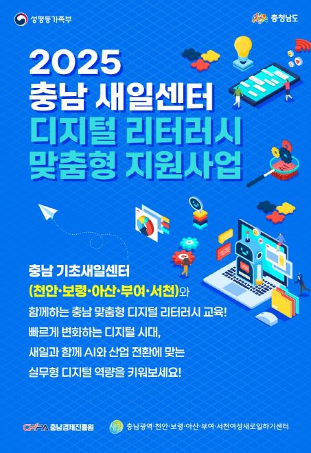 (아름다운교육신문) 충남경제진흥원 내 충남광역여성새로일하기센터는 천안·보령·아산·부여·서천 등 도내 5개 기초새일센터와 함께 '2025 새일센터 디지털 리터러시 맞춤형 지원사업'을 본격적으로 추진한다고 밝혔다.