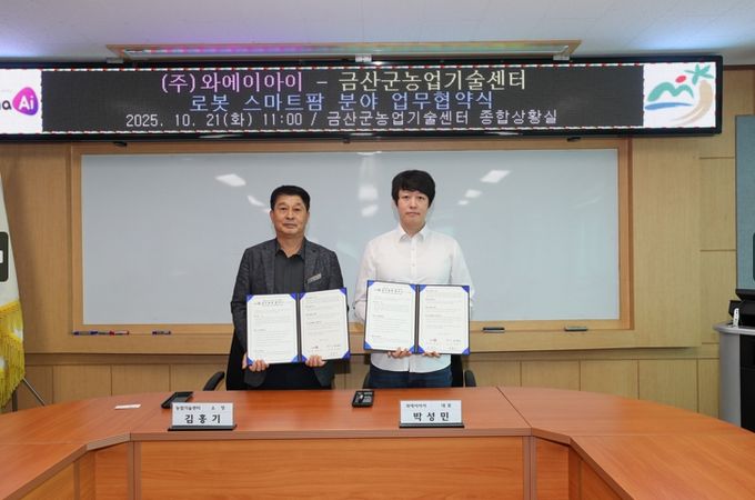 (아름다운교육신문) 금산군농업기술센터와 인공지능 로봇 개발 기업 ㈜와에이아이는 지난 21일 센터 종합상황실에서 잎들깨 전용 지능형 수확로봇 개발과 스마트팜 기술 고도화 업무협약을 체결했다.