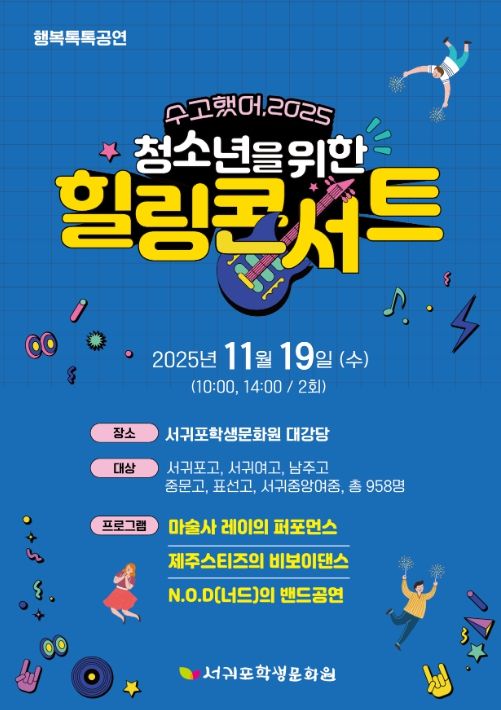 (아름다운교육신문) 제주도교육청 서귀포학생문화원은 19일 서귀포학생문화원 대강당에서 행복톡톡 공연 ‘수고했어 2025, 청소년을 위한 힐링콘서트’를 오전 10시와 오후 2시 두 차례에 걸쳐 개최한다.