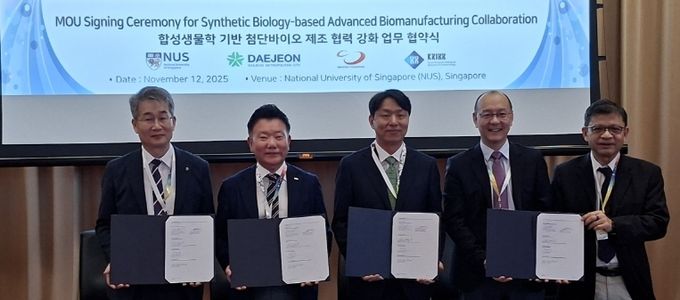 (아름다운교육신문) 대전시는 합성생물학 분야에서 세계적 선도기관인 싱가포르 국립대(NUS)와 첨단 바이오제조 공동연구 및 국제협력을 위한 업무협약(MOU)을 12일 체결했다.
