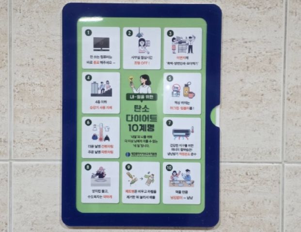 (아름다운교육신문) 대전서부교육지원청은 공공기관의 적극적인 에너지 절약 문화를 정착시키고, 민원인과 직원들이 함께 보고 참여할 수 있도록 지원청 내 화장실에 ‘내-일을 위한 탄소 다이어트 10계명’ 홍보물을 제작하여 부착했다고 밝혔다.
