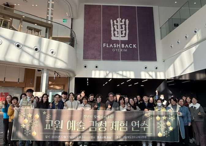 이번 연수는 경주 지역에 새롭게 개관한 ‘플래시백 계림(Flashback Gyerim)’에서 진행되며, 예술교육 최일선에서 학생들의 마음 성장을 위해 헌신하고 있는 교원들에게 예술적 영감을 제공하고 미래지향적인 예술교육의 방향을 모색하기 위해 기획됐다.