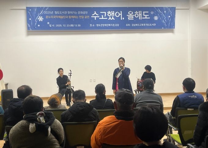 이번 문화공연은 '수고했어, 올해도'라는 제목으로 열렸으며, 연말을 맞아 청도군장애인복지관 이용자와 직원들에게 따뜻한 위로와 응원의 메시지를 전하고자 마련됐다. 타악과 해금 연주, 소리꾼이 어우러진 국악 공연은 전통음악의 흥겨움과 생동감을 선사했으며, 관객들은 박수와 웃음으로 함께 공연을 즐기며 현장을 한층 따뜻하게 만들었다.
