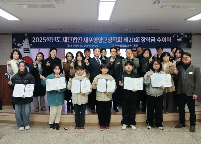 (아름다운교육신문) 경상북도영양교육지원청은 12월 24일 관내 초등학교 6명을 대상으로 재단법인 재포영양군장학회가 주관하는 2025학년도 재단법인 재포영양군장학회 제20회 장학금 수여식을 영양교육지원청 3층 대회의실에서 실시했다.