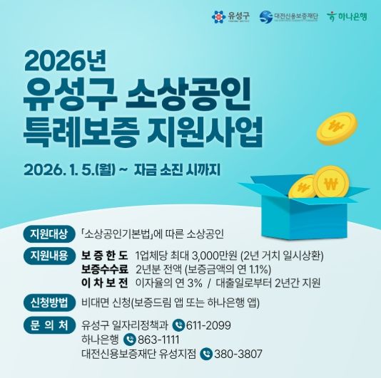 (아름다운교육신문) 대전 유성구는 소상공인과 창업 기업의 금융 부담 완화를 위해 ‘2026년도 소상공인·창업 특례 보증 지원 사업’을 운영한다.