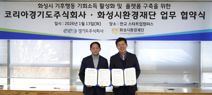 (아름다운교육신문) 경기도주식회사는 13일 경기도 성남시 판교 스타트업캠퍼스에서 화성시환경재단과 ‘기후행동 기회소득 활성화 및 화성시 플랫폼 구축을 위한 업무협약’을 체결했다.