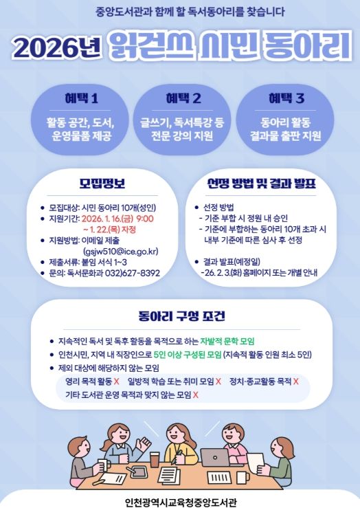 (아름다운교육신문) 인천광역시교육청중앙도서관은 지역사회 독서문화 확산과 시민의 자발적 독서활동 지원을 위해 ‘읽걷쓰 시민 동아리’를 16일부터 모집한다.