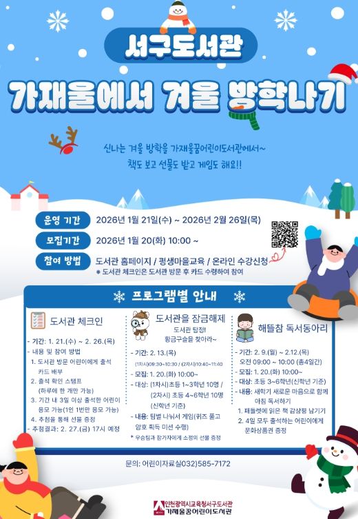 (아름다운교육신문) 인천광역시교육청서구도서관은 겨울방학을 맞이한 어린이들이 도서관에서 특별하고 즐거운 경험을 쌓을 수 있는 '가재울에서 겨울 방학나기'를 21일부터 운영한다.