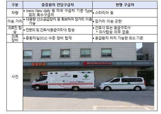 한편, 치료를 위해 병원을 옮겨야 하는 환자는 중증도가 높은 경우가 많으므로 전원 과정에서 전문적인 감시와 처치가 요구된다. 이에 보건복지부는 중증환자의 안전한 전원을 위해 2024년 말부터 의사가 탑승하는 중증환자 전담 구급차를 경기지역에서 시범 운용하고 있다.