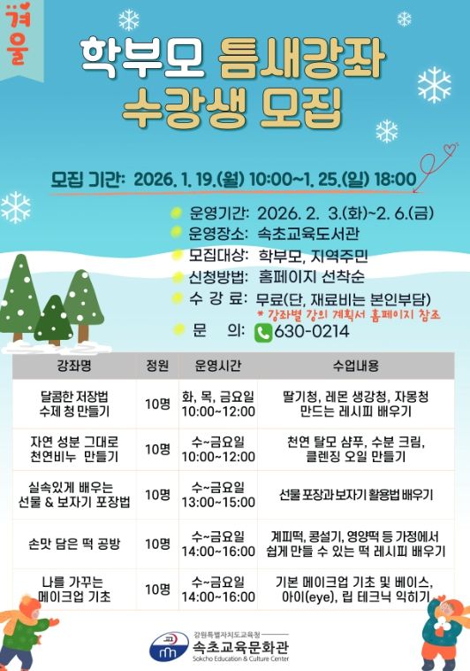 (아름다운교육신문) 속초교육문화관은 3월 정규 강좌 개강에 앞서 학습 공백기를 활용한 학습 기회를 제공하고자, 2월 3일부터 6일까지 학부모와 지역주민을 대상으로 ‘겨울 학부모 틈새강좌’를 운영한다.