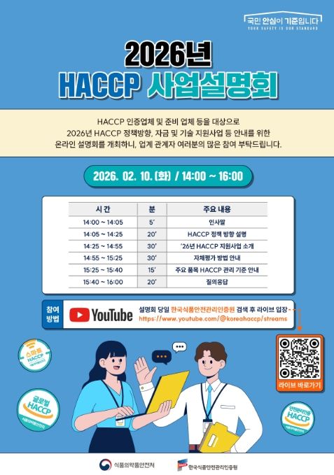 아울러 식약처는 이번 지원사업과 올해 해썹 정책 방향 등을 안내하기 위해 한국식품안전관리인증원과 함께 2월 10일 ‘2026년 해썹 사업 온라인 설명회’를 개최한다.