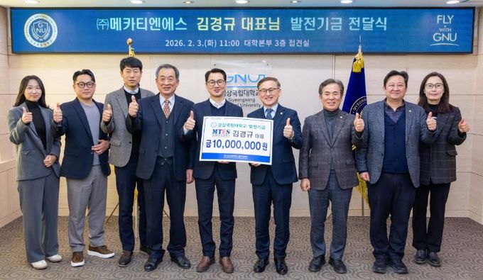 (아름다운교육신문) 경상국립대학교는 2월 3일 오전 11시 대학본부 3층 접견실에서 ㈜메카티엔에스 김경규 대표가 대학발전기금 1000만 원을 기부했다고 밝혔다.