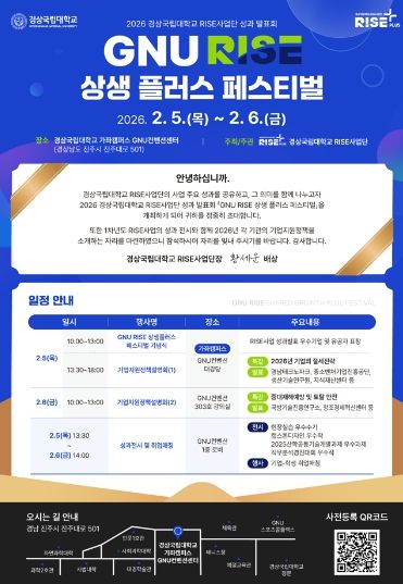 (아름다운교육신문) 경상국립대학교 라이즈(RISE) 사업단(단장 황세운)은 2월 5~6일 가좌캠퍼스 GNU 컨벤션센터 대강당 일원에서 RISE사업의 1차 연도 성과발표회 및 기업지원정책 설명회 ‘GNU RISE 상생 플러스 페스티벌’을 개최한다.