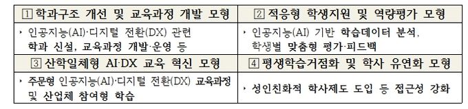 교육부는 2026년 신규 사업 공모를 통해 총 24개 내외 사업단(전문대학)을 선정하여 사업단별 최대 10억 원(총 240억 원)을 지원할 예정이다. 주요 추진 내용으로는 ▲인공지능(AI)·디지털 전환(DX) 환경 조성, ▲재학생·교직원·지역주민 맞춤형 인공지능(AI) 역량 강화, ▲대학별 특화모형 구축이 있다.