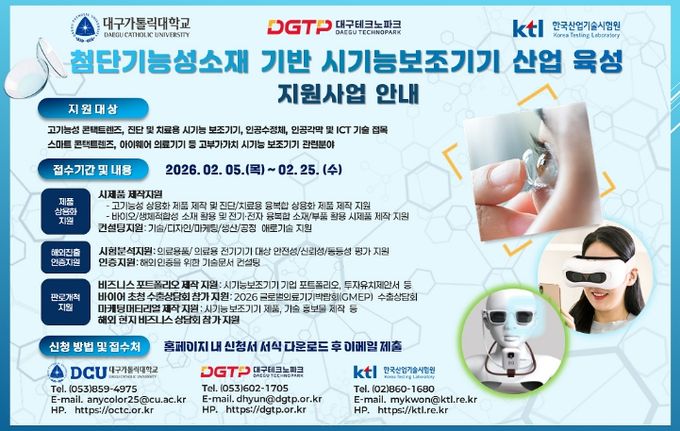 (아름다운교육신문) 대구광역시는 산업통상부, 경상북도와 함께 ‘2026년 첨단 기능성 소재 기반 시(視)기능 보조기기 육성사업’을 본격 추진하고, 참여기업을 모집한다.