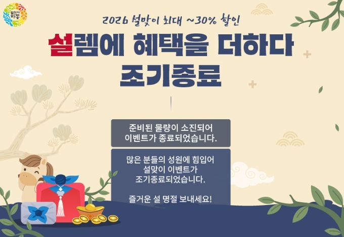 (아름다운교육신문) ‘별천지하동쇼핑몰’에서 설 명절을 맞아 진행한 할인 행사가 소비자들의 폭발적인 반응 속에 준비된 물량을 모두 소진하며 조기 종료됐다.