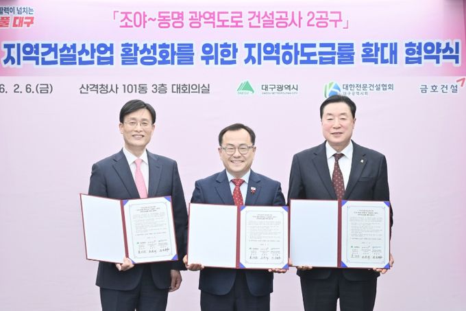 (아름다운교육신문) 대구광역시는 2월 6일오후 2시 시청 산격청사에서 ‘조야~동명 광역도로건설 2공구’ 공사에 수반되는 하도급의 지역업체 참여 비율 확대를 위해 금호건설㈜, 대한전문건설협회 대구시회와 3자 협약을 체결했다.