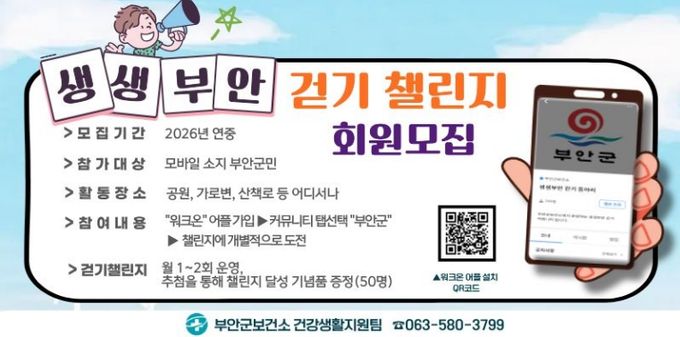 (아름다운교육신문) 부안군보건소는 군민의 일상 속 걷기 실천을 활성화하고 건강생활실천 문화를 확산하기 위해 시공간의 제약 없이 스마트폰으로 누구나 쉽게 참여할 수 있는 모바일 걷기 앱 ‘워크온(WalkOn)’을 활용한 생생부안 걷기 챌린지 회원을 매월 모집한다고 밝혔다.