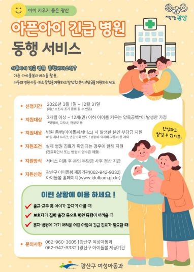 (아름다운교육신문) 광주 광산구가 3월 1일부터 부모가 곁에 없거나 돌봐주기 어려운 상황에서 갑작스럽게 진료가 필요한 아동을 위한 ‘아픈 아이 긴급 병원 동행’ 서비스를 시행한다.