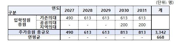 (아름다운교육신문) 보건복지부는 2월 10일 오후 2시, 정부서울청사(서울 종로구 소재)에서 제7차'보건의료정책심의위원회'(이하 보정심)를 개최하여 지역․필수․공공의료 강화를 위해 서울을 제외한 32개 의과대학을 대상으로 2027년부터 2031년까지 의사인력 양성 규모를 연평균 668명 늘리기로 결정했다. 기존 의대 증원 인원 중 2024학년도 정원(3,058명)을 초과하는 부분은 모두 지역의사로 선발된다. 또한 증원 초기 의학교육 현장의 부담을 완화하기 위하여 단계적으로 증원을 추진한다.
