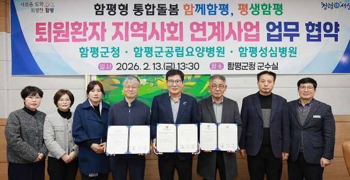 함평군은 13일 “퇴원환자의 원활한 지역사회 복귀를 지원하기 위해 함평군공립요양병원·함평성심병원과 ‘퇴원환자 지역사회 연계사업’ 업무협약을 체결했다”고 밝혔다.