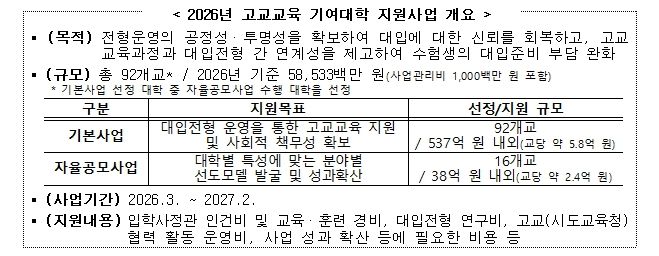 (아름다운교육신문) 교육부은 2월 24일, ‘2026년 고교교육 기여대학 지원사업 기본계획’을 발표한다.
