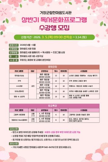 (아름다운교육신문) 거창군 한마음도서관은 오는 3월 5일부터 군민들의 지적 욕구를 충족시키고 문화적 소양을 높이기 위한 ‘상반기 독서문화 프로그램’ 수강생을 모집한다.