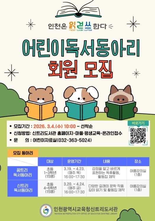 (아름다운교육신문) 인천광역시교육청신트리도서관은 오는 3월 4일부터 ‘어린이 독서동아리’참여자를 모집한다.