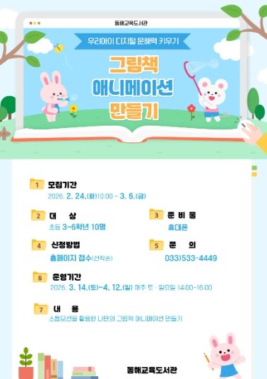(아름다운교육신문) 동해교육도서관은 초등학생의 창의적인 독서활동과 미디어 활용 역량 강화를 위해 ‘그림책 애니메이션 만들기’를 운영한다.
