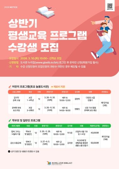(아름다운교육신문) 경상북도교육청 봉화도서관(관장 이영숙)은 지역 주민의 평생학습 기회를 넓히기 위해 상반기 평생교육 및 토요 늘봄도서관 프로그램 수강생을 모집한다.