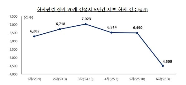 최근 5년(’21.3~’26.2) 누계 기준으로는, (주)순영종합건설(383건, 세부 하자수 기준), (주)대명종합건설(318건), 에스엠상선(주)(311건), 제일건설(주)(299건), (주)대우건설(293건) 순으로, 대형 건설사의 세부 하자 수 감소에 따라 그간 1차 발표(’23.9)부터 유사했던 상위 건설사 순위가 금번 발표 시 크게 변동된 것으로 나타났다.